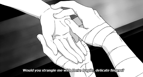Le lycéen à la chevelure de jais me fit basculer sur le lit. Se tenant au-dessus de moi, il enroula ses mains chaudes comme la braise autour de mon cou avant de se mettre à serrer de toutes ses forces, tentant tant bien que mal de m’étrangler… on dirait. Un gémissement mêlant haine et douleur s’échappa de ses lèvres, se mêlant à sa respiration douce et bruyante. Un sourire se dessina sur mon visage. Je ne pus m’empêcher de rire, attendri. Qu’essayait donc-t-il de faire ? C’était mignon de le voir s’acharner comme ça… alors qu’il n’avait pas la force suffisante pour m’infliger ne serait-ce une blessure. Je l’ai fait basculé afin de passer à mon tour au-dessus de lui, tenant ses poignets fermement contre le matelas. J’ai posé sa main gauche sur ma joue avant de caresser avec douceur ses longs doigts de pianiste.